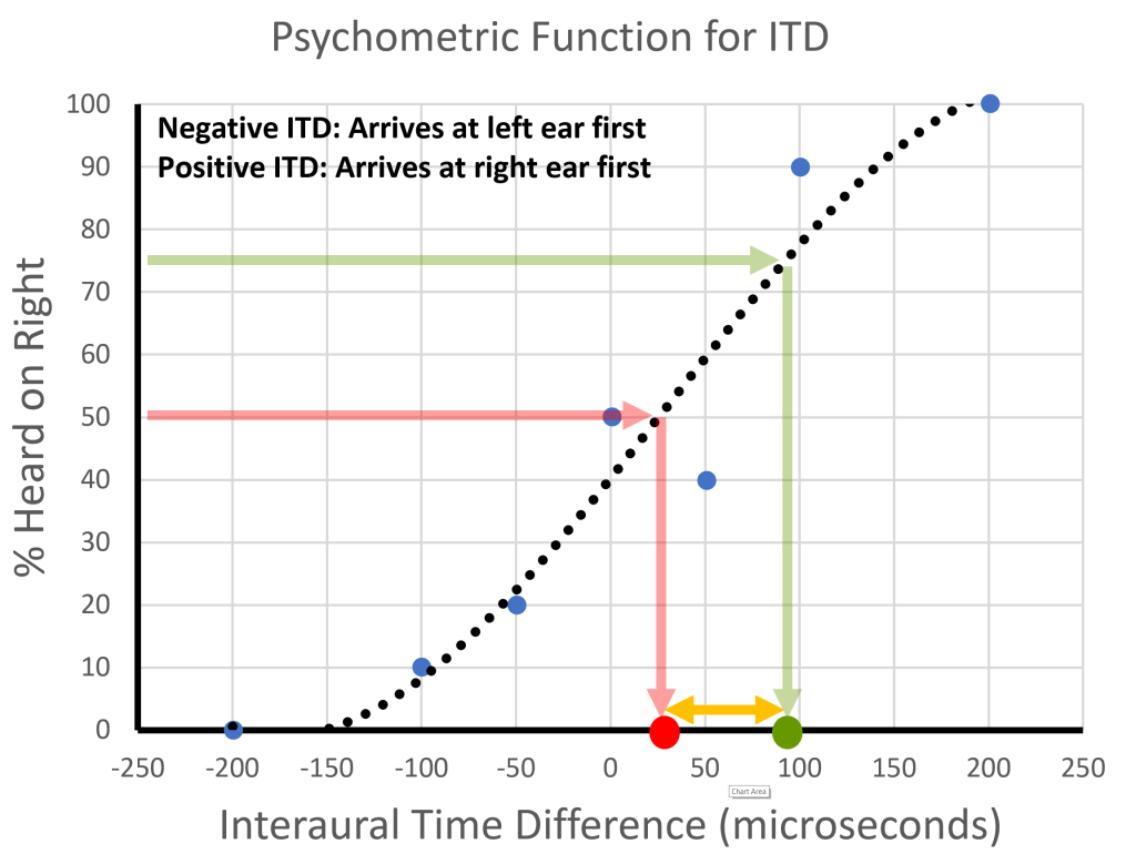 75% Point: Identify the ITD that the subject hears on the right 75% of the time (green dot). This is deemed to be a reliable rightward response because it is too consistent to reflect random guessing.